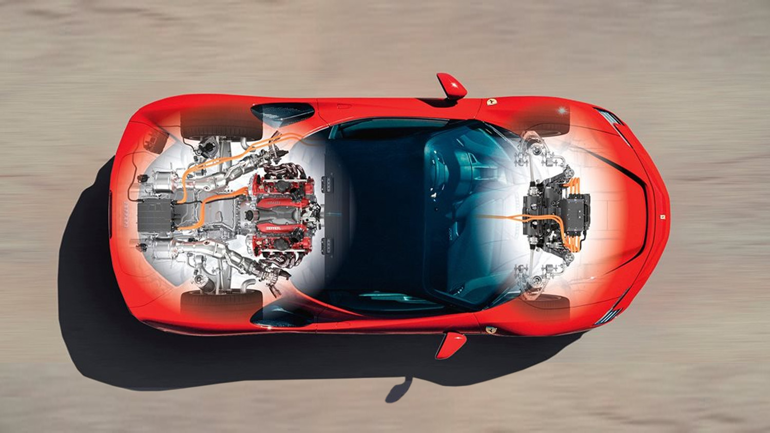 The SF90 Stradale is equipped with three electric motors capable of generating a total of 220 cv (162 kW). A high performance Li- ion battery provides power to all three motors and guarantees a 25-kilometre range in all-electric eDrive mode, using just the front axle. When the internal combustion engine is turned off, the two independent front motors deliver a maximum speed of 135 km/h with longitudinal acceleration of ≤0.4 g. Reverse can only be used in eDrive mode which means the car can be manoeuvred at low speeds without using the V8. This mode is ideal for city centre driving or any other situation in which the driver wishes to eliminate the sound of the Ferrari V8.