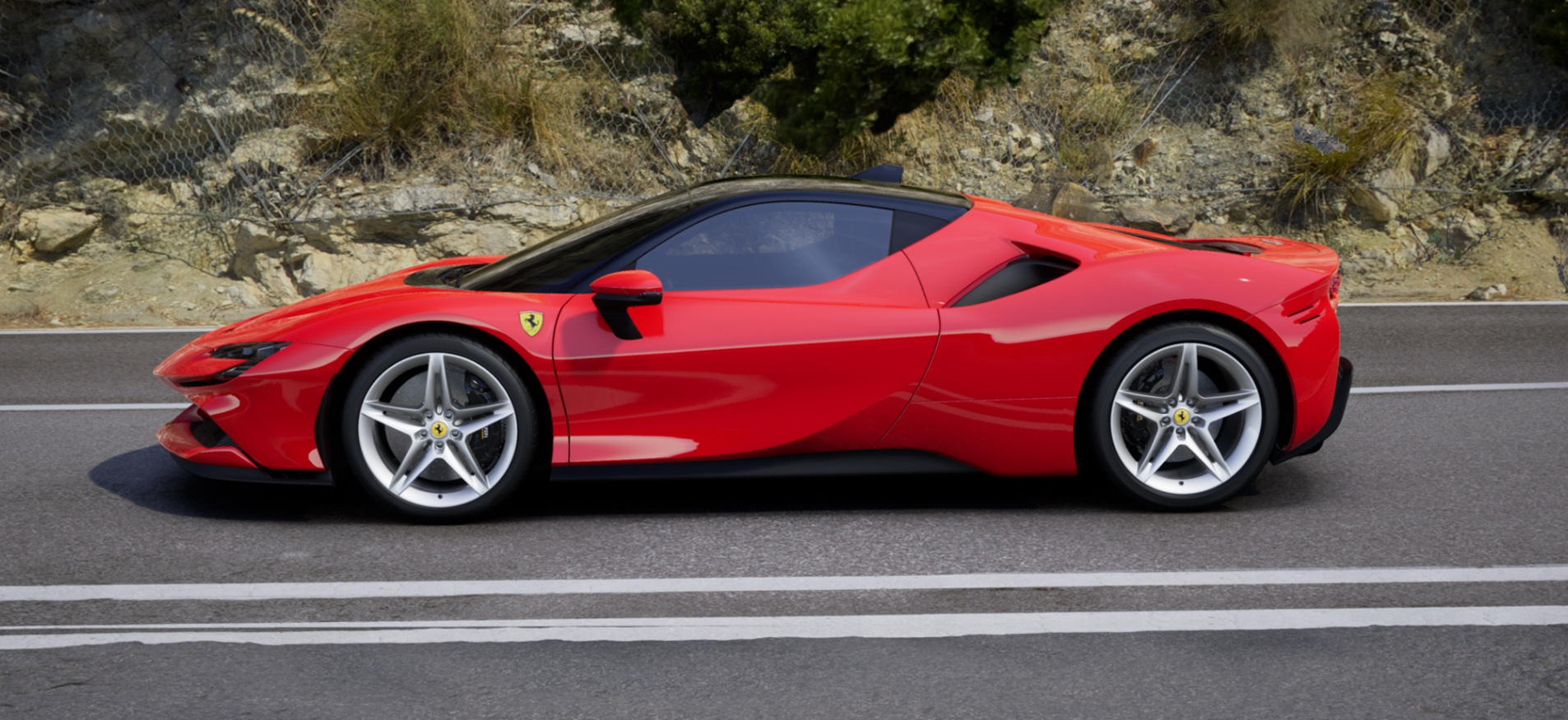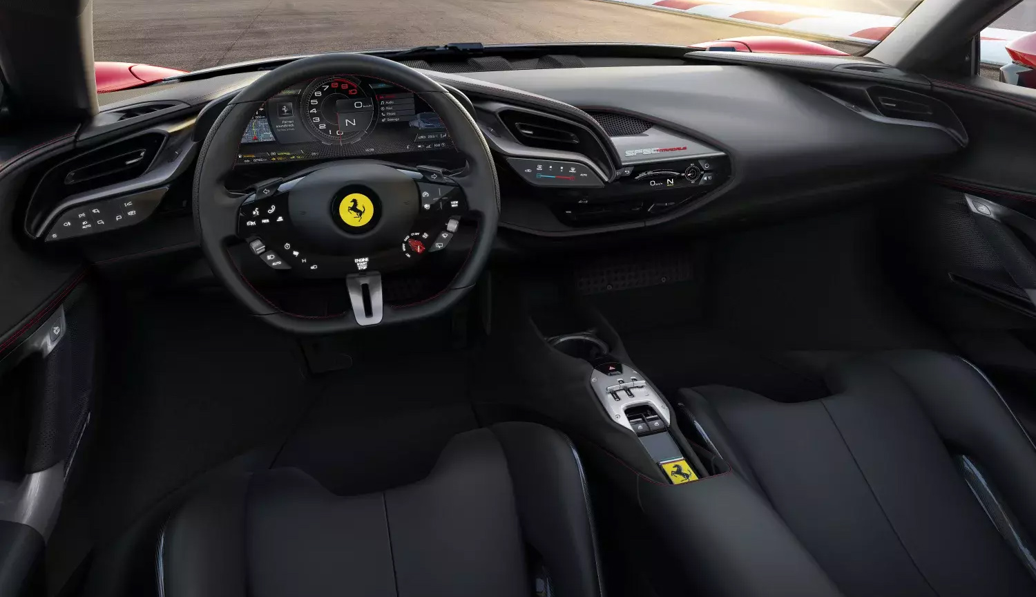 Inside, the Ferrari SF90 Stradale design marries sporty ergonomics with passenger comfort. Even with their tapering rooflines, both cars effortlessly house up to 5 occupants. In front of the driver, the continuous horizontal lines of the dash hold a centre instrument console and touch screen panel that just seem to float. And front Sport seats, available in leather or leather-free, give optimum support, even when cornering at speed.